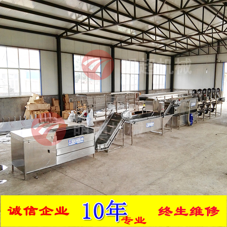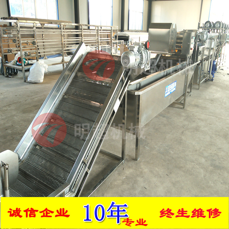 6.漂燙冷卻線:根莖類切制的是土豆、紅薯、蓮藕、茄子、黃瓜、蔬菜、山野菜等等,比如土豆切成絲后,里面的纖維收到破壞,跟空氣結(jié)合可使土豆絲變黑,有類似情況的蔬菜,都需要進(jìn)行漂燙冷卻生產(chǎn)線,針對蔬菜如果沒有這種情況的這道工序可以不用,具體還要看情況而定,漂燙冷卻生產(chǎn)線主要是采用水浴式,水可達(dá)到0-100攝氏度以內(nèi),對果蔬進(jìn)行漂燙、殺青、蒸煮或者包裝袋的殺菌等等,是一種多功能巴氏殺菌冷卻線的設(shè)備,水槽內(nèi)部設(shè)有循環(huán)水泵,水的溫度均勻,果蔬進(jìn)行漂燙的過程中受熱均勻,網(wǎng)帶伸縮性強(qiáng),在這里介紹一下網(wǎng)帶,網(wǎng)帶的密度是根據(jù)要物料的大小來單獨(dú)定制的,這個(gè)就跟廠家有關(guān)系了,在這里就簡單的讓用戶知道有這方面知識(shí),簡單了解一下就可以,漂燙后的果蔬需要進(jìn)行冷卻,冷卻機(jī)的冷卻方式采用常溫水或強(qiáng)制冰水,還有為了讓蔬菜的保鮮程度高一些,可以采用磁化水,這個(gè)在咨詢前一定要跟我們明超機(jī)械銷售人員說清楚