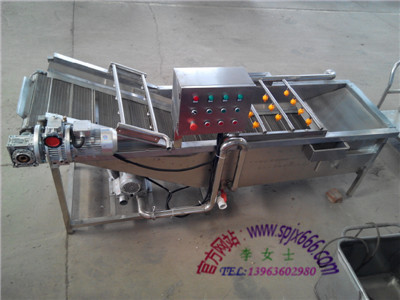 2、蔬菜清洗機(jī):該機(jī)用于挑選好的蔬菜進(jìn)行清洗,把泥沙、雜草以及異物清洗干凈出來,采用鼓風(fēng)機(jī)通過管道吹進(jìn)水槽里面,將水達(dá)到翻騰的狀態(tài),模擬手工清洗,不會(huì)對(duì)蔬菜造成損害,達(dá)到清洗的效果,水槽旁邊有溢水口,溢水口上端設(shè)有過濾網(wǎng)裝置,清洗下來的雜草異物通過溢水口,清理出來,溢水口底部設(shè)有過濾裝置,水在循環(huán)的情況下可以將底部的泥沙等雜物過濾出來,水在循環(huán)的過程中不會(huì)再次進(jìn)入到水槽和把排水口阻死的現(xiàn)象,排污口設(shè)計(jì)合理,可根據(jù)客戶的要求,安排位置。整機(jī)為SUS304不銹鋼材質(zhì)制造,符合我國(guó)對(duì)食品衛(wèi)生的需求。