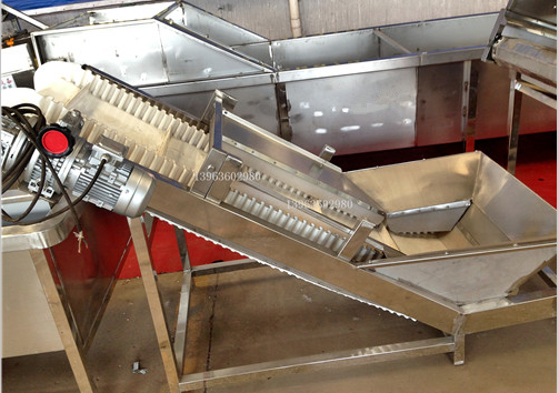 5、提升機(jī):提升機(jī)配合切段機(jī)適用,將切段機(jī)切出來的蔬菜提升到下一道工序。該機(jī)采用不銹鋼材質(zhì)制造,傳送帶為PVC食品級(jí)材質(zhì),符合我國(guó)對(duì)食品衛(wèi)生的需求。