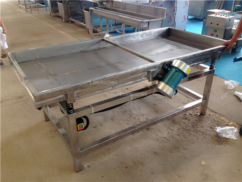 6、震動(dòng)瀝水機(jī):分切后的蔬菜帶有大量的水滴,通過震動(dòng)瀝水機(jī)將蔬菜大量的水滴去掉,該機(jī)根據(jù)蔬菜的品種可設(shè)計(jì)