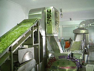 挑選帶→蔬菜清洗機(jī)→蔬菜漂洗機(jī)→切段機(jī)→提升機(jī)→震動(dòng)瀝水機(jī)→提升機(jī)→蔬菜烘干設(shè)備