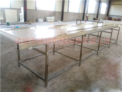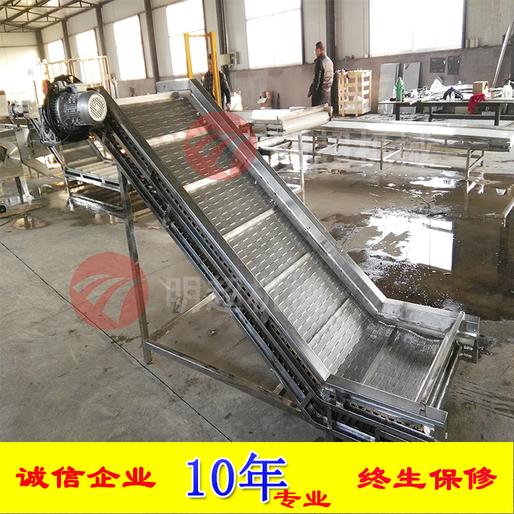 該機(jī)采用雙層進(jìn)行輸送,上面一層采用pvc輸送,當(dāng)蔬菜輸送到中間之后,通過強(qiáng)制分離裝置,分離到切菜機(jī)入口,當(dāng)蔬菜從切菜機(jī)入口進(jìn)入到里面,切完后再通過底層的第二層不銹鋼網(wǎng)帶輸送提升到下一工序,運(yùn)行速度可調(diào)。