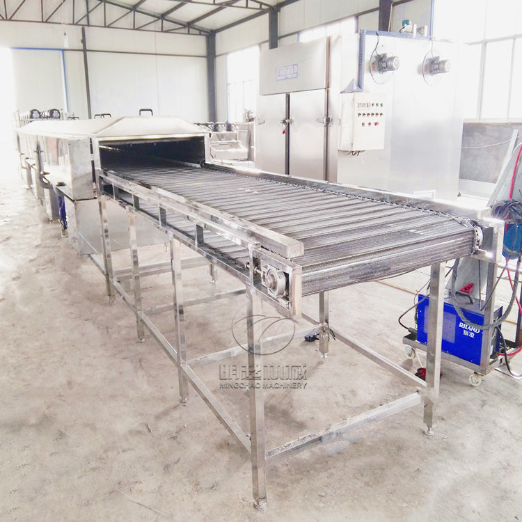 1、工藝流程:原料清洗去泥沙→噴淋清洗→風(fēng)干機(jī)→烘烤設(shè)備→速凍