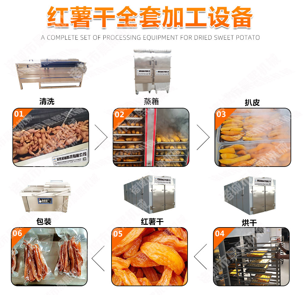 紅薯干加工設(shè)備需要設(shè)備有:紅薯清洗機(jī),紅薯脫皮清洗機(jī),紅薯蒸箱,紅薯烘干房,紅薯真空包裝機(jī),紅薯拉伸膜包裝機(jī)等設(shè)備組成
